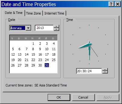 หรือไม่ก็กดปุ่มบน Keyboard ปุ่ม Win (ที่เป็นรูปธง Windows น่ะ) ค้างไว้แล้วกดปุ่ม R จะปรากฎหน้าต่างเล็กๆ ขึ้นมาแล้วพิมพ์ว่า timedate.cpl จะมีหน้าต่างให้ตั้งเวลา ก็ตั้งให้ถูกต้องครับ