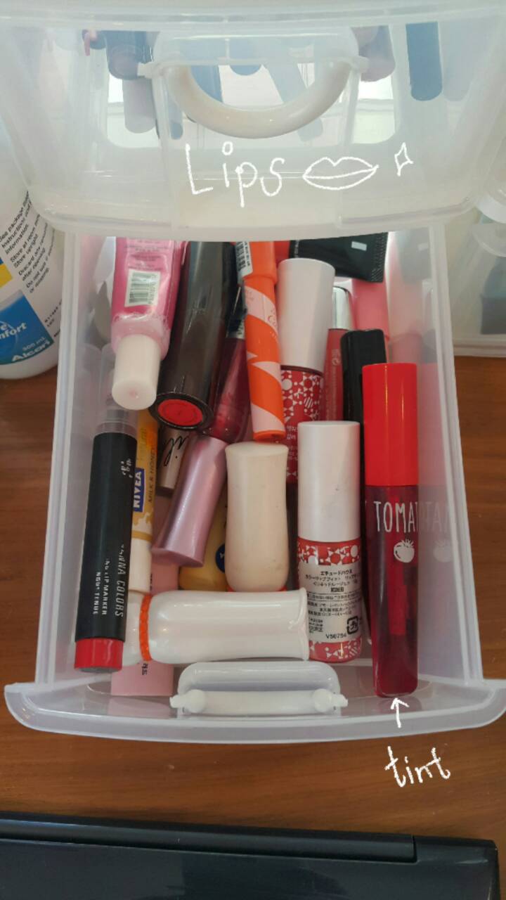 ชั้นสุดท้ายชั้นที่4 จะเป็นพวกลิปทั้งหมดเลย ไม่ว่าจะเป็น tint,ลิปแบบปากกา,แบบครีม เยอะเยะมากมาย(เราเป็นคนที่ชอบซื้อลิปสติกมากกกแบบมากมากก แม่ก็จะบ่นแบบมีปากเดียวจะซื้ออะไรเยอะเยะ55555 ก็หนูชอบง้ะะ)