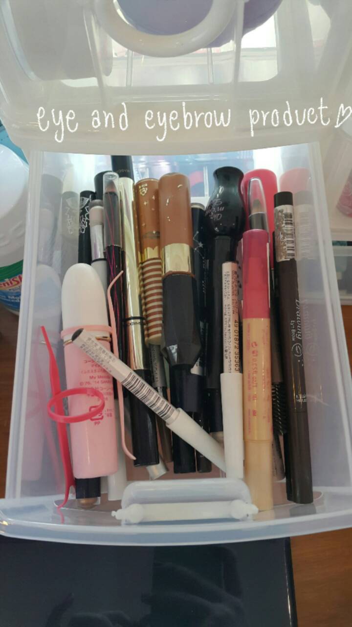 ซ้ายชั้นที่3 จะเป็นพวกที่เกี่ยวกับตาและคิ้วค่ะ เช่น eyeliner, eyeshadow stick, eyebrow mascara, eyebrow pencil, กาวติดตาสองชั้นจ้าา