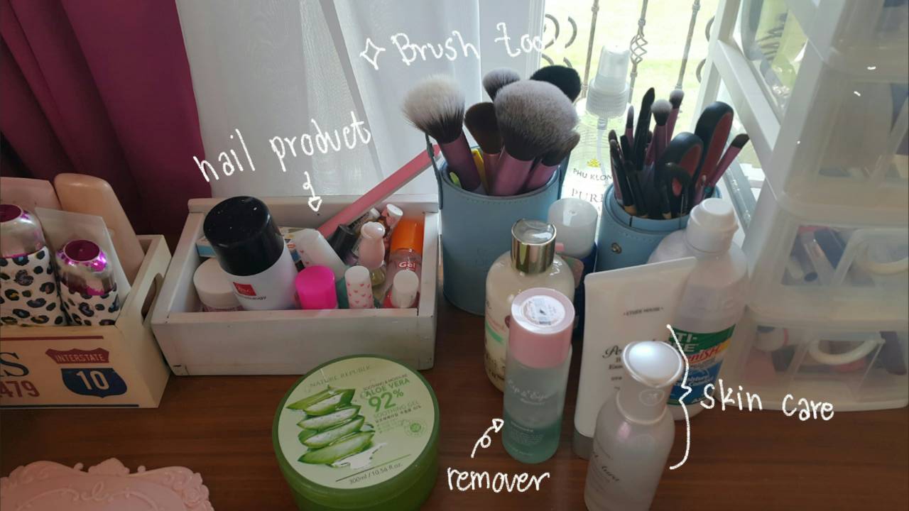 ก็จะเป็นพวกแปรงต่างๆหลายไซส์ กับ พวกที่เกี่ยวกับเล็บเช่นที่ทาเล็บอะไรแบบนี้555555555 อ้อแล้วตรงข้างหน้าๆก็จะมีพวก skin careที่เราชอบใช้ แล้วก็น้ำยาล้างคอนแทคเลนส์จ้าววว