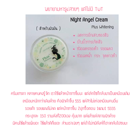 อันดับแรก ครีมเทวดา ของพี่บุ้ง หลายคนคงเคยใช้ และเคยแพ้ หน้าเยินกันมาแล้วช่ะ 55555 เค้าโชคดีที่หยุดใช้แล้วสิวไม่เห่อ เค้าใช้แล้วหน้าขาวขึ้นนะ แต่ก็ใช้เวลา หน้าเนียนๆ สิวยุบบ้างขึ้นบ้าง แล้วแต่อารมณ์ 55555 แต่เลิกใช้ก็กลับมาเป็นเหมือนเดิมเหมือนหนักกว่าเดิมด้วย คือผิวดำขึ้น 555 แต่สิวไม่เห่อเหมือนคนอื่นรอยดำ รอยแดงไม่ลด แต่หน้าขาวขึ้น 2ปุกซื้อตอน 1แถม1 5555กระปุกละ 150 รวมส่งก็200เอง คุ้มมาก แต่แล้วแต่สภาพผิวด้วยมีคนใช้แล้วแพ้เยอะ ใช้แล้วดีก็เยอะ ส่วนเค้าเฉยๆ แต่ถ้าไม่มีตังค์ก็อาจกลับไปซบนะ (มันขาวไม่สุดอ่ะ อารมณ์แบบเคลือบๆ รอยแดงรอยดำไม่จางลงด้วย แต่มันก็ขาว 5555 )