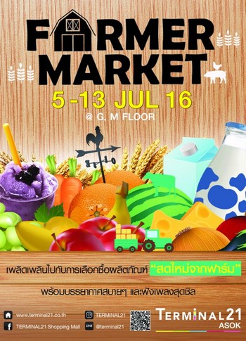 ศูนย์การค้าเทอร์มินอล 21 จัดงาน "ฟาร์มเมอร์ มาร์เก็ต 2016" (Farmer Market 2016) เอาใจคนรักสุขภาพ โดยรวบรวมอาหารและเครื่องดื่มที่ได้จากวัตถุดิบธรรมชาติและการคัดสรรแบบสดๆ ส่งตรงจากฟาร์ม อาทิ ผักสด ผลไม้สด รวมไปถึงผลิตภัณฑ์อินทรีย์แบบครบเครื่อง มาให้เลือกซื้อเลือกชิมกันอย่างจุใจ ท่ามกลางบรรยากาศของสวนธรรมชาติ พร้อมเสียงเพลงเพราะๆ จากวง "รูม 39" (Room 39) และวง "เดอะ แฟบ โฟร์" (The Fab Four) ที่จะมาช่วยขับกล่อมให้เพลิดเพลินตั้งแต่วันที่ 5 - 13 กรกฎาคม 2559 ณ บริเวณชั้น จี และชั้น เอ็ม ศูนย์การค้าเทอร์มินอล 21 อโศก