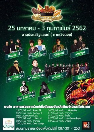 จัดเต็มอาหารและเครื่องดื่มมากมายในเทศกาลปิ้งย่าง "Food Fun Fest" อิ่มอร่อยกับร้านอาหารชื่อดังจากทั่วประเทศกว่า 50 ร้านค้า พร้อมเพลิดเพลินกับสวนสนุกชุดใหญ่ และรับชมคอนเสิร์ตสุดสนุกจากศิลปินดัง ตั้งแต่วันที่ 25 มกราคม 2562 - 3 กุมภาพันธ์ 2562 เวลา 17.00 น. เป็นต้นไป ณ ลานประเสริฐแลนด์ (กาดเชิงดอย) จังหวัดเชียงใหม่