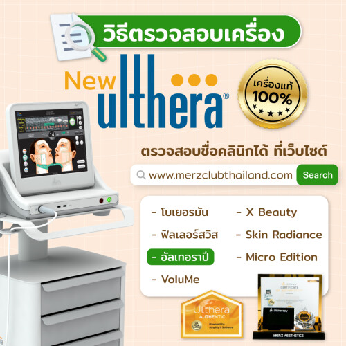 - ใช้เครื่องแท้ มีสติกเกอร์ Ulthera Authetic และสติกเกอร์รับรองจาก Merz Aesthetic ซึ่งเป็นผู้นำเข้าแปะอยู่ หรือนำชื่อคลินิกความงามที่สนใจไปค้นหาในเว็บไซต์ของ Merz Aesthetic ประเทศไทย