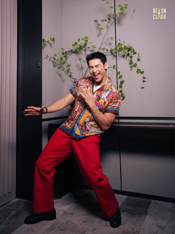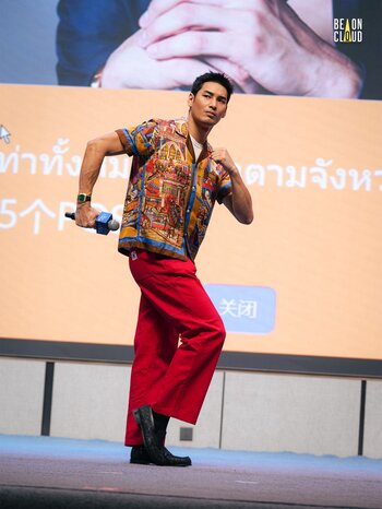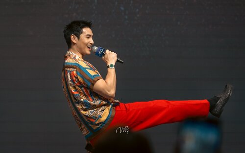 ส่วนลุคสองในช่วง Meet & Greet ก็มากับเสื้อพิมพ์ลายและกางเกงสีแดงแปร๋นคัลเลอร์ฟูล