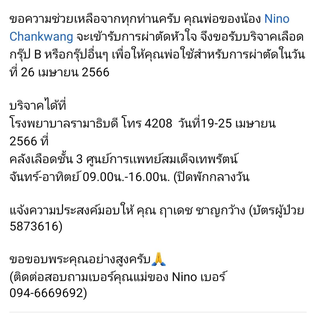 ขอความช่วยเหลือจากทุกท่านครับ คุณพ่อของน้อง @ello_nino จะเข้ารับการผ่าตัดหัวใจ จึงขอรับบริจาคเลือดกรุ๊ป B หรือกรุ๊ปอื่นๆ เพื่อให้คุณพ่อใช้สำหรับการผ่าตัดในวันที่ 26 เมษายน 2566