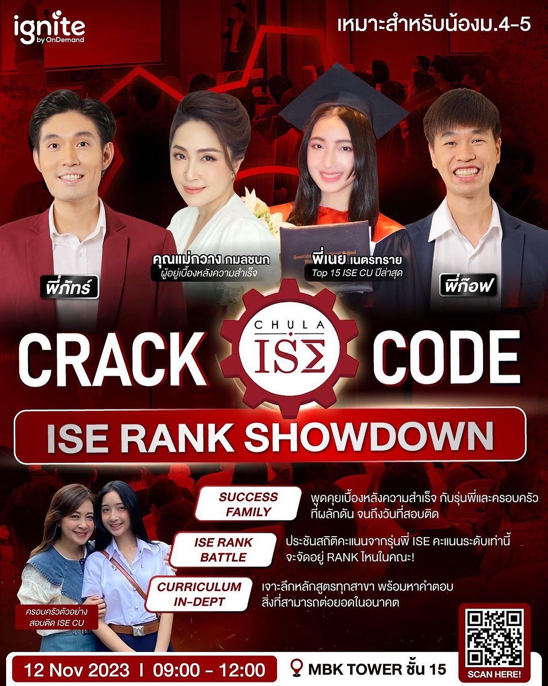 อยากเข้า ISE CU คณะวิศวะอินเตอร์ยอดฮิตตลอดกาลจากรั้วจุฬา ต้องมางาน Crack ISE Code : ISE Rank Showdown งานที่พี่ก๊อฟและพี่ภัทร์จะพามา Crack ทุกประเด็นสำคัญของคณะ ISE!!