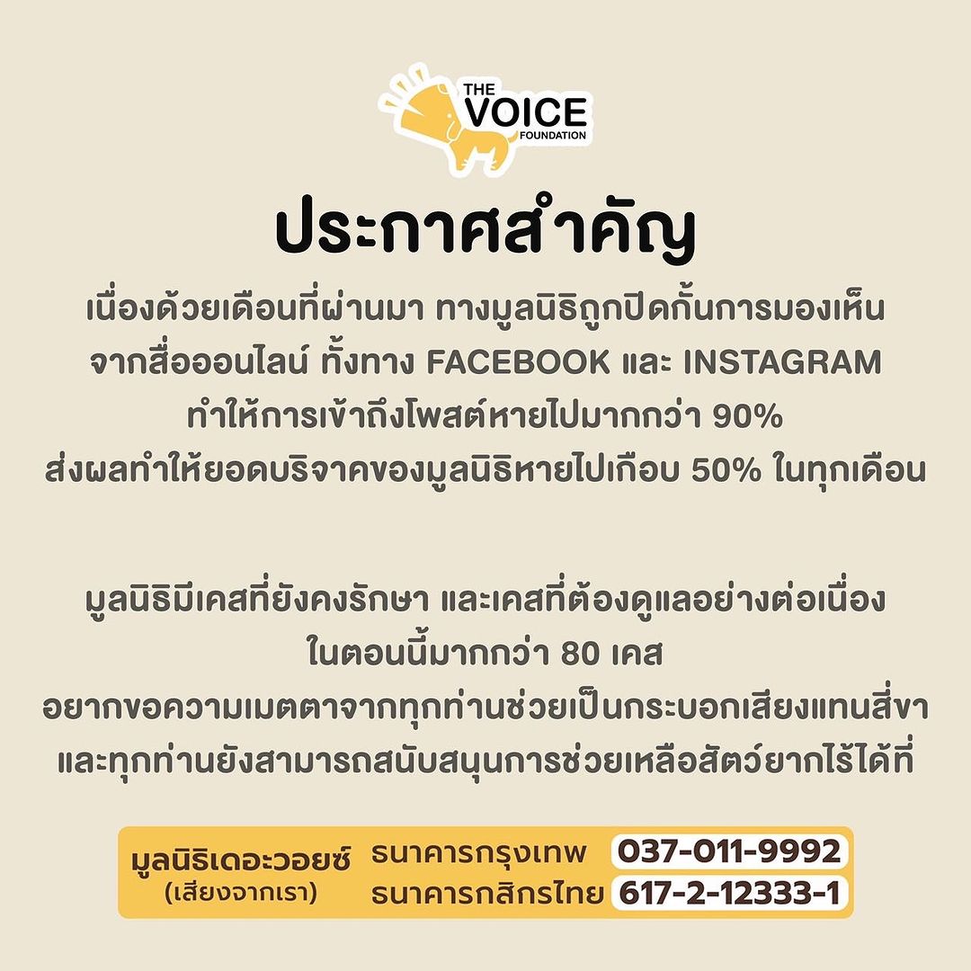 มูลนิธิเดอะวอยซ์(เสียงจากเรา) ขอแจ้งว่าทางเพจถูกปิดกั้นการมองเห็นจากทางโซเชียล ทำให้การเข้าถึงหายไปมากกว่า 90% ส่งผลกระทบต่อยอดบริจาคไปมากกว่าครึ่ง ขณะนี้ทางทีมงานกำลังดำเนินการแก้ไขค่ะ