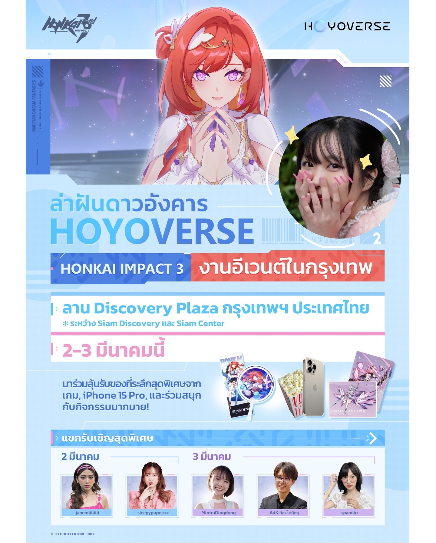 เตรียมตัวไปเจอกันได้ในงานฉลองเปิดตัว Honkai Impact 3 Part 2 “ล่าฝันดาวอังคาร” วันที่ 2-3 มีนาคมนี้ ที่ ลาน Discovery Plaza มาพร้อมกิจกรรมแจกของรางวัลมากมาย ตั้งแต่ของที่ระลึกไปจนรางวัลใหญ่ iPhone 15 Pro!! สำหรับผู้เล่น Part 1 ก็มีของเซอไพรส์ให้อีกด้วย แถมยังมีแขกรับเชิญมากมายอย่าง มินตัน ปูเป้ เจน สแปม แอดก้องไก่กุ๊กๆ ฮูกหักเกมมิ่ง และคอสเพลเยอร์ชื่อดังเพียบ ส่วนใครที่ไม่เคยเล่น Part 1 บอกเลยว่าไม่ต้องกลัว สามารถเปิดโลกใหม่ เริ่มเล่น Part 2 เดินทางสู่ดาวอังคารกันได้เลย!!