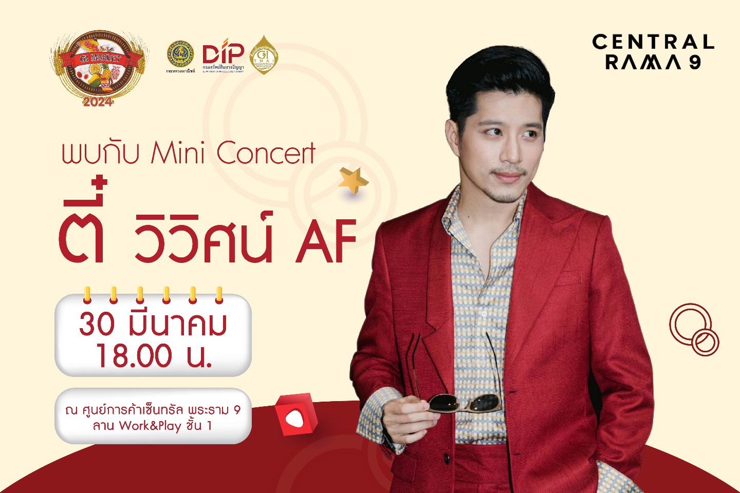 กรมทรัพย์สินทางปัญญา กระทรวงพาณิชย์ ขอเชิญชวนเที่ยวงาน “GI Market 2024” ชวนทุกท่านร่วมช้อป กับสุดยอดสินค้า GI ระดับพรีเมี่ยมกว่า 60 ร้านค้าจากทั่วประเทศ มาไว้ทีในงานเดียว ณ ลาน Work & Play ชั้น 1 ศูนย์การค้าเซ็นทรัลพระราม 9