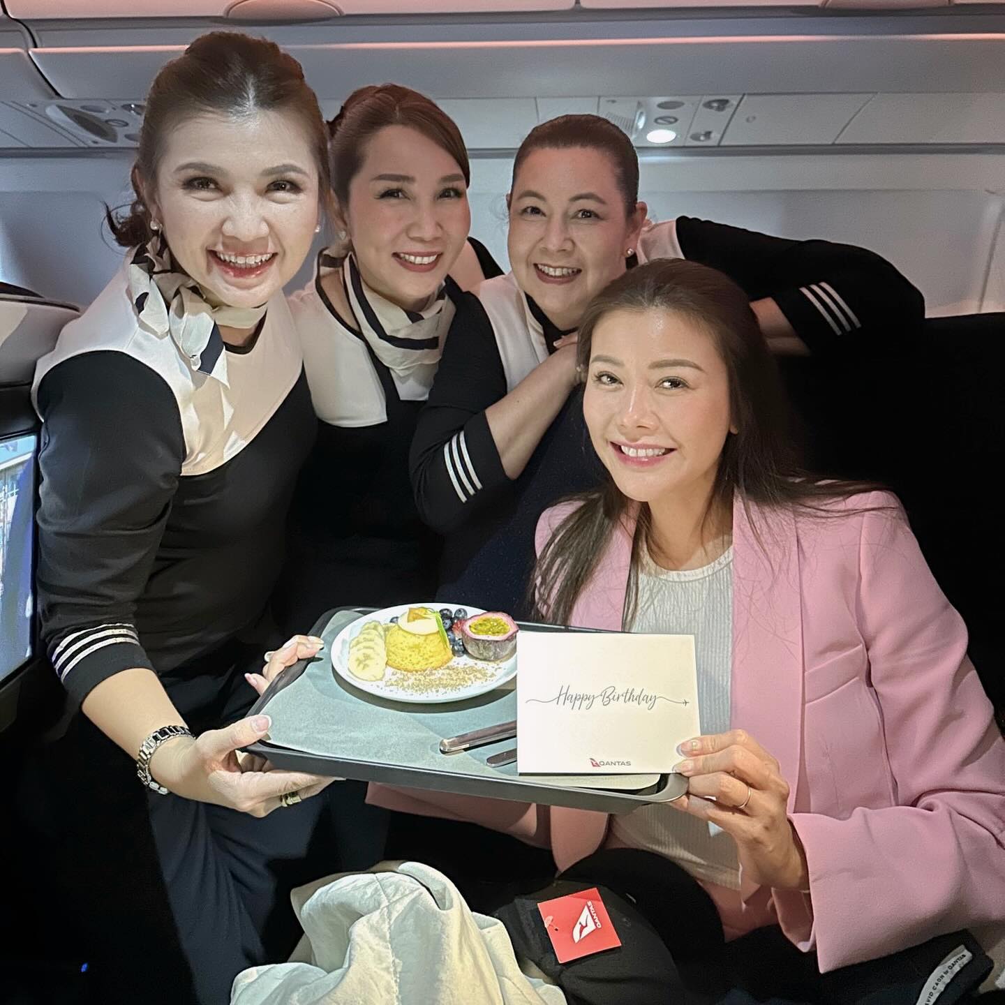 เรื่องแรก ไฟล์ทกลับจาก Sydney - Bkk QF 295 ตื่นมา กลางทาง ได้ surprised กับเสียงกระซิบ “ happy birthday ” นะคะ คุณเก๋ 🎂❤️🙏🏻 นำทีม flight attendant โดย @pangsupita ของ Qantas มาสุขสันต์วันเกิด ย้อนหลังให้เก๋ และ พร้อม ทั้งคู่เลย ขอบคุณมากๆนะคะ ส่งรูปเบื้องหลัง ให้ดู แถมเขียนการ์ดอวยพร มีลายเซ็นต์ ทุกคนเลยด้วย เรา 2 คน ปลื้มมากๆเลยนะคะ 🥰❤️🫶🏻