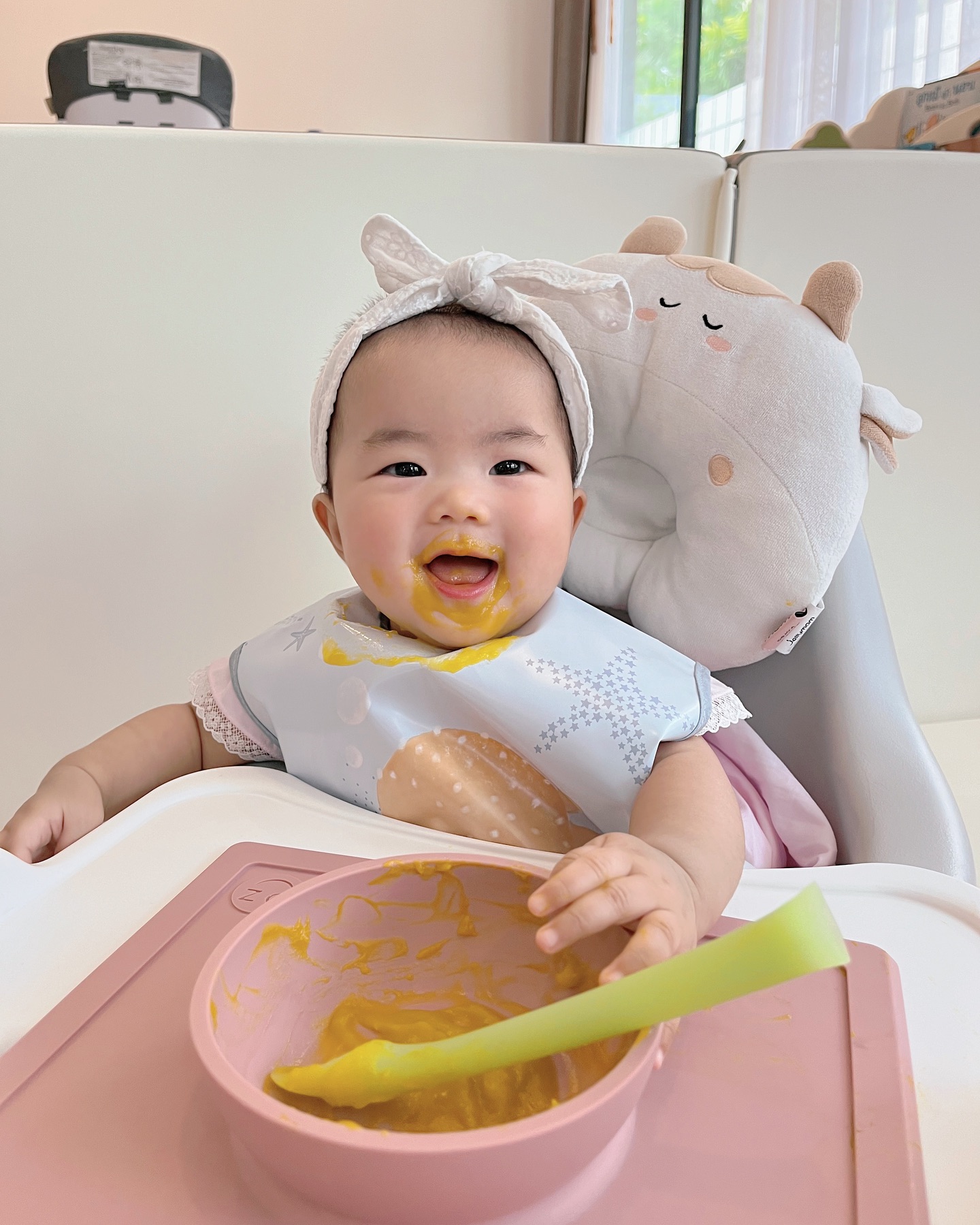 ฉลอง 6 เดือนด้วยเมนูแรกของหนู “ฟักทองบดราดนมแม่”