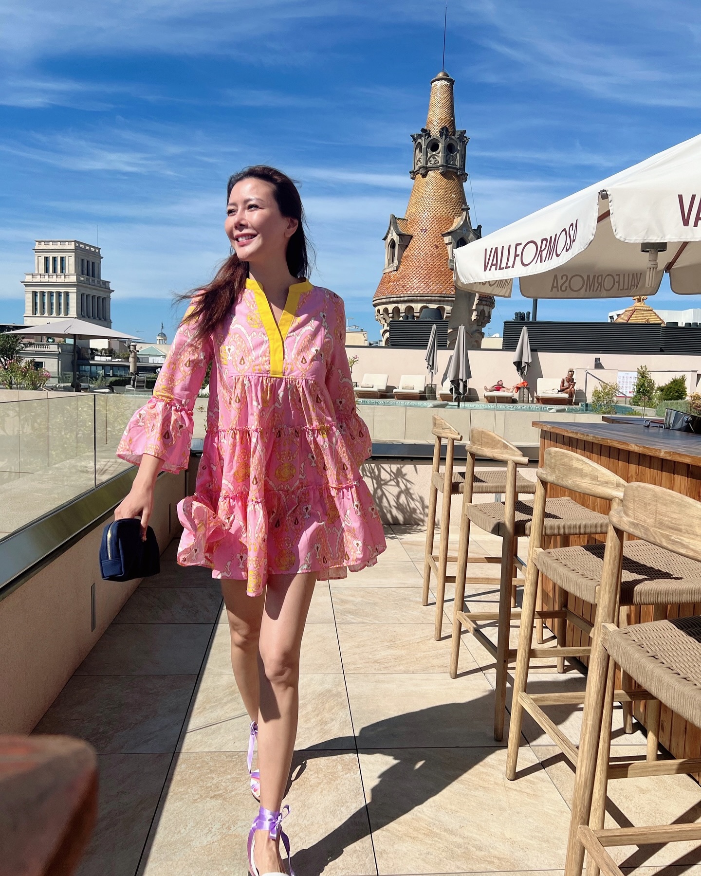 Day2 My rooftop outfit @jimthompson.official and shoes special handmade for me @karo_valencia_kv 🩷💜@handmadethebrand 🩷💜#kpespaingermany24 #ootd #everywhereismyrunway #barcelona 🙌🏻🇪🇸 อากาศดี ขึ้นมารับ วิตามินดีสักนิด