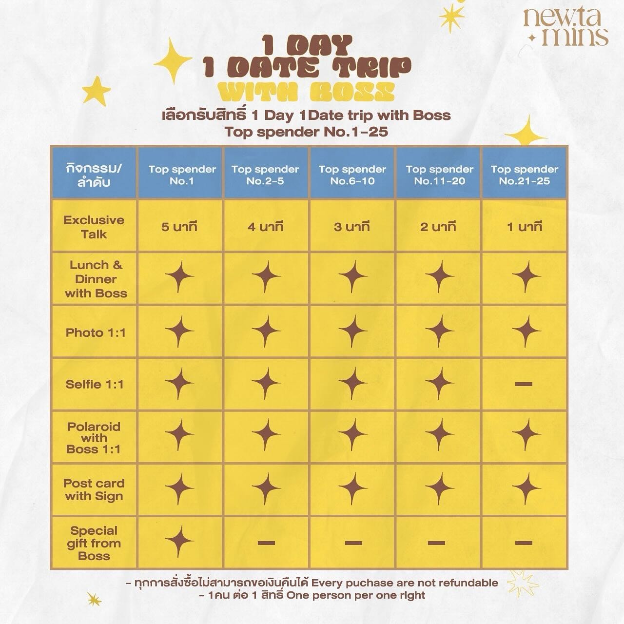 1 Day 1 Date Trip with Boss✨🎉 พร้อมที่จะออกเดินทางไปเที่ยวกับบอสรึยังครับ? ร่วมเดินทางไปพร้อมกันในวันที่ 27 ตุลาคม 2024 สามารถสะสมยอด Top spender ได้ตั้งแต่วันนี้จนถึงวันที่ 10 ตุลาคม 2024 ภายใน 22.00 น.