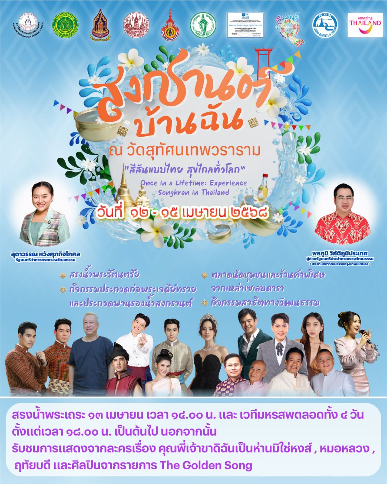 กระทรวงวัฒนธรรม โดยสภาวัฒนธรรมกรุงเทพมหานคร และ วัดสุทัศนเทพวรารามราชวรมหาวิหาร ร่วมกันจัดงาน สงกรานต์บ้านฉัน ณ วัดสุทัศนเทพวรารามราชวรมหาวิหาร “สีสันแบบไทย สุขไกลทั่วโลก“ ชวนทุกท่านสนุกสนานไปกับสงกรานต์แบบไทย ในวันที่ 12 – 15 เมษายน 2568 พบกับกิจกรรมสุดพิเศษมากมาย อาทิเช่นการแสดงจาก โอปอล - สุชาตา ช่วงศรี มิสยูนิเวิร์สไทยแลนด์ 2024 , โบ๊ท ธารา , ป๊อป ศิร์รัฐ , ป้าแจ๋ว ยุทธนา จากละครเรื่อง คุณพี่เจ้าขา , ปีเตอร์แพน ทัศน์พล , แก๊ป จักริน จากละครเรื่อง หมอหลวง , กานต์ ณัฐชา , บิว ณัฐพล จากละครเรื่อง ฤทัยบดี และ มินิคอนเสิร์ตจาก สปาย ภาสกรณ์ , ผิงผิง สรวีย์ , แพรว รัตนาพร , เอฟ รัฐพงศ์ โกลเด้นซอง ตลาดนัดชุมชนและร้านเด็ดร้านดัง อย่าง ร้านครัวบ้านพี่เอ เอ ศุภชัย , ร้านข้าวเหนียวหมู-เนื้อแดดเดียว ข้าวหมู-ไก่กระเทียม By TOP’S HOMEMADE ท็อป ดารณีนุช , ร้านลูกชิ้นธงธง ธงธง มกจ๊ก, ร้านสมูทตี้ดีใจ ผัดไท ดีใจ , ร้านไก่ย่างอังกอร์ กัญจน์ ภักดีวิจิตร ,ร้านFox Cha La Lemon พิมพ์ พิมพ์พรรณ , ร้านลำพายก๋วยเตี๋ยวเรือ เฟิส์ท เอกพงศ์ , ร้านอลหม่านจานใหม่ (เด็ด) ไก่ วรายุฑ , ร้านMari คุณแม่เปีย, ร้านขนมเปี๊ยะขั้นเทพ