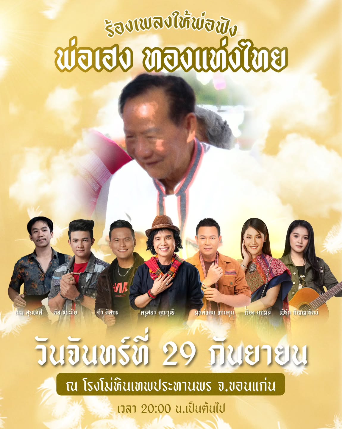 คืนนี้ (29 กย.68) ไปร่วมรำลึกถึง "พ่อเฮง ทองแท่งไทย" นักบุญแห่งขุนเขา..ผู้จากไป กับ คอนเสิร์ต มนต์แคน แก่นคูน เต็มวง พร้อมเหล่าศิลปินที่ต่างมุ่ง มาร้องเพลงให้พ่อเฮงฟัง..ไปพ้อกันเด้อครับ🤍🎶❤️#พ่อเฮงทองแท่งไทย#คอนเสิร์ต #โรงโม่หินเทพประทานพร#มนต์แคนแก่นคูน #เวียงนฤมล #เฟิร์นกัญญารัตน์ #เนมสุรพงศ์ #ดำดัสกร #ตัสชนะชัย #ครูสลา #พ่อ #รำลึก #ภูผาม่าน #ขอนแก่น