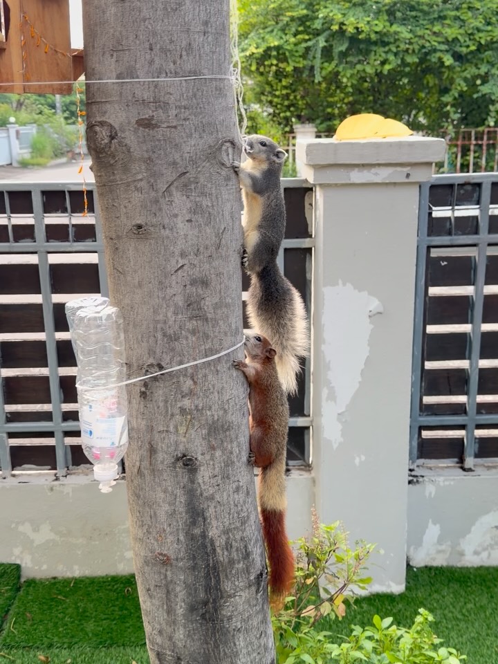 กระรอกน้อยสองตัว.. นิวยอร์คกับบอสตัน.. เป็นกระรอกน้อยที่ลูกสาวสองสาวเค้าเลี้ยงมาตั้งแต่ตัวเล็กๆ…ตอนนี้มันโตเป็นผู้ใหญ่แล้ว.. มีครั้งนึงเจ้านิวยอร์ก(ตัวสีแดง) มันหลุดจากกรงออกไปสามวัน กลับบ้านมาในสภาพหิวโซ.. เพราะคงหาอาหารกินเองไม่เป็น… แล้วก็มีเพื่อนตามกลับมาด้วยสองสามตัว… ก็เลยรู้สึกว่า… เขาได้ไปอยู่อิสระตามธรรมชาติน่าจะมีความสุขกว่า… แล้วพอมาที่บ้านก็จะมีอาหารให้กินทุกวัน.. ก็เลยตัดสินใจเอาบ้านของเขามาแขวนอยู่บนต้นไม้ข้างนอกซะเลย… แล้วก็ปล่อยเจ้าบอสตันกับนิวยอร์กออกมาใช้ชีวิตข้างนอกด้วยกันเลย… เพราะเจ้านิวยอร์กมันเคยไปใช้ชีวิตในโลกภายนอกมาแล้ว…มันกลับบ้านถูก ก็เลยคิดว่าครั้งนี้เจ้าบอสตันไปด้วยมันไม่หลงแน่ๆ .. แล้วก็เป็นจริงตามนั้นครับ… เขาสองตัวไปอยู่ข้างนอกก็จะกลับมากินอาหารเช้าทุกวัน และตอนเย็นๆทุกวัน… กลางวันมันก็จะวิ่งเล่นอยู่บนต้นไม้บริเวณบ้านผม… ที่สำคัญพาเพื่อนเพื่อนมาด้วยหลายตัวเลย..555 นี่แหละ.. คือความน่ารักของสัตว์และธรรมชาติ… ผมเชื่อว่าสิ่งมีชีวิตทุกอย่างมันก็มีความคิด มีหัวใจเหมือนกับคนเรานี่แหละครับ… ปล. เจ้านิวยอร์กและกระรอกตัวอื่นๆมันเรียนรู้โลกภายนอกแล้ว…มันรู้ว่าอะไรเป็นภัยกับมัน มันก็จะต้องสอนเจ้าบอสตันให้รู้ด้วยเหมือนกัน.. เพราะบางทีมีแมวจรจัดผ่านไปผ่านมาชอบจ้องไปบนต้นไม้เหมือนกัน.. ✌🏻🥰😍👍🏻 #หนุ่มคงกระพันofficial #หนุ่มคงกระพันfc #newyorkboston #screwel