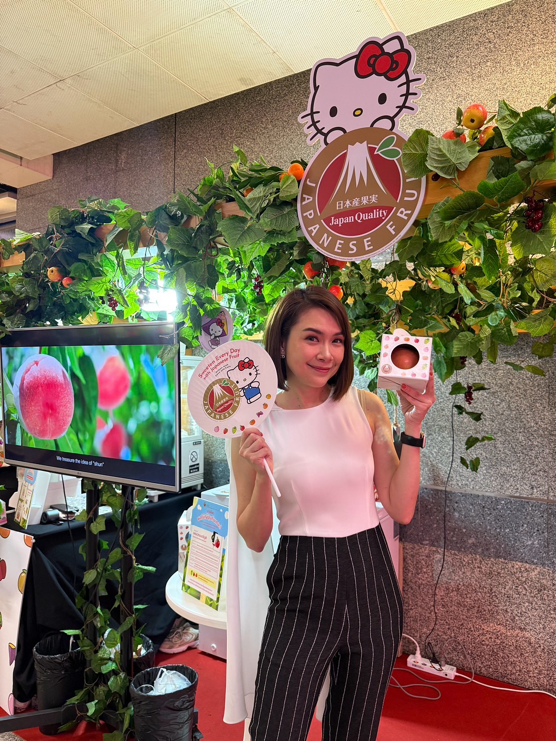 เจ้า Hello Kitty ในงานน่ารักมาก! เปลี่ยนร่างเป็นผลไม้หลายชนิด แล้วก็ซ่อนอยู่ตามจุดต่าง ๆ ในงานด้วย ถ่ายรูปมาเพียบ ไปร่วมสนุกกันได้นะคะ เค้าแจกขนม ผลไม้ให้ชิมฟรีด้วย