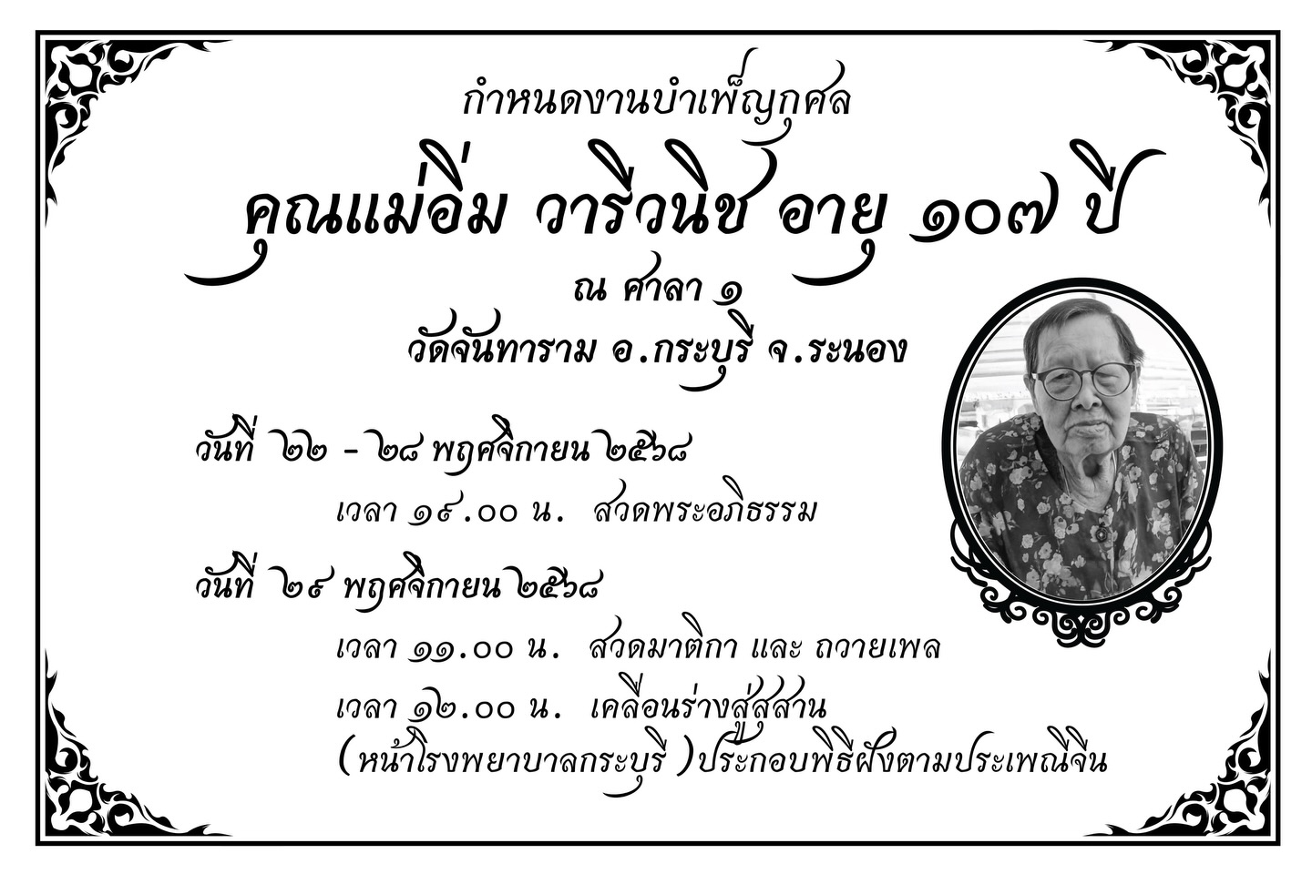 กำหนดการงานบำเพ็ญกุศล คุณยายอิ่ม วารีวนิช