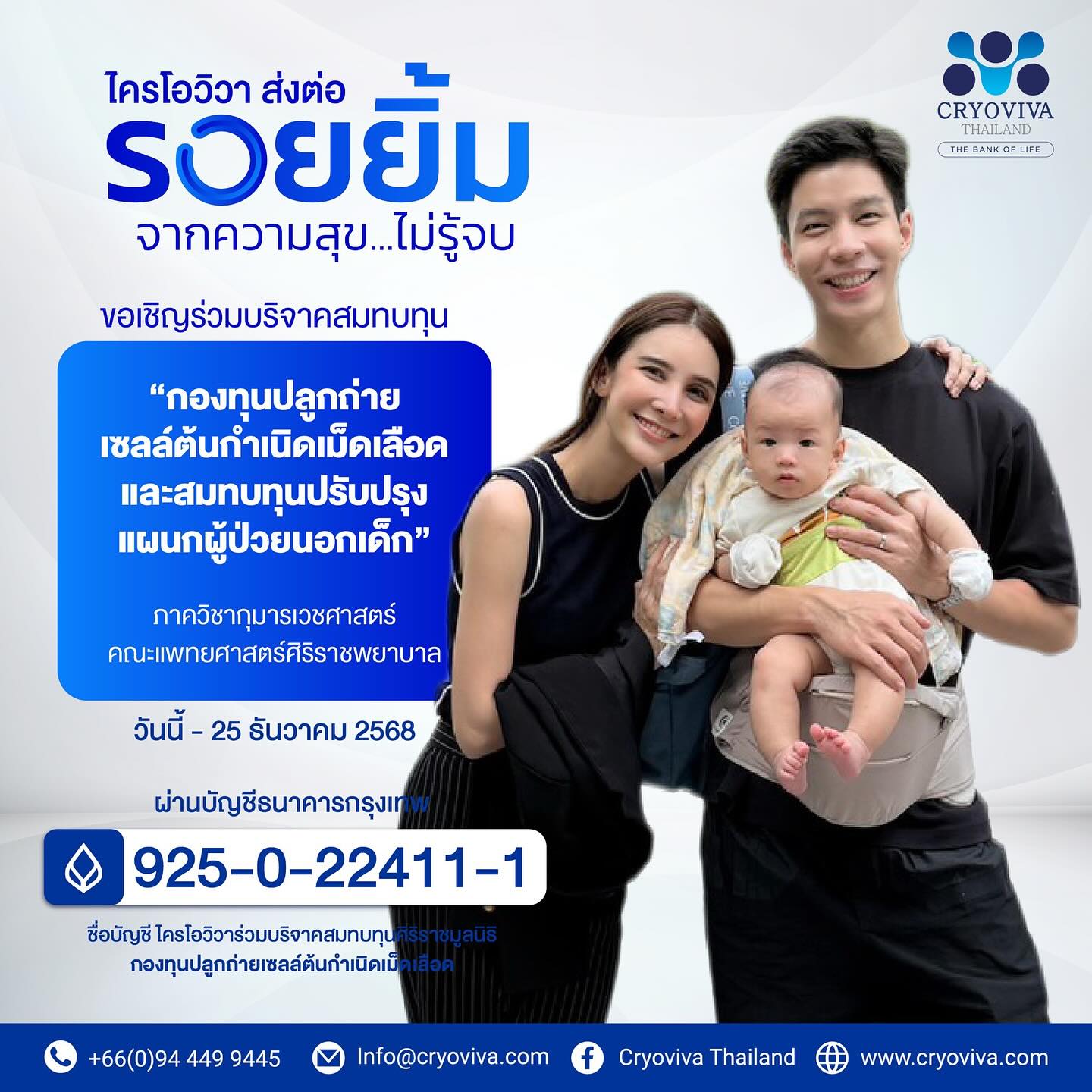 ชื่อบัญชี: ไครโอวิวาร่วมบริจาคสมทบทุนศิริราชมูลนิธิ กองทุนปลูกถ่ายเซลล์ต้นกำเนิดเม็ดเลือด