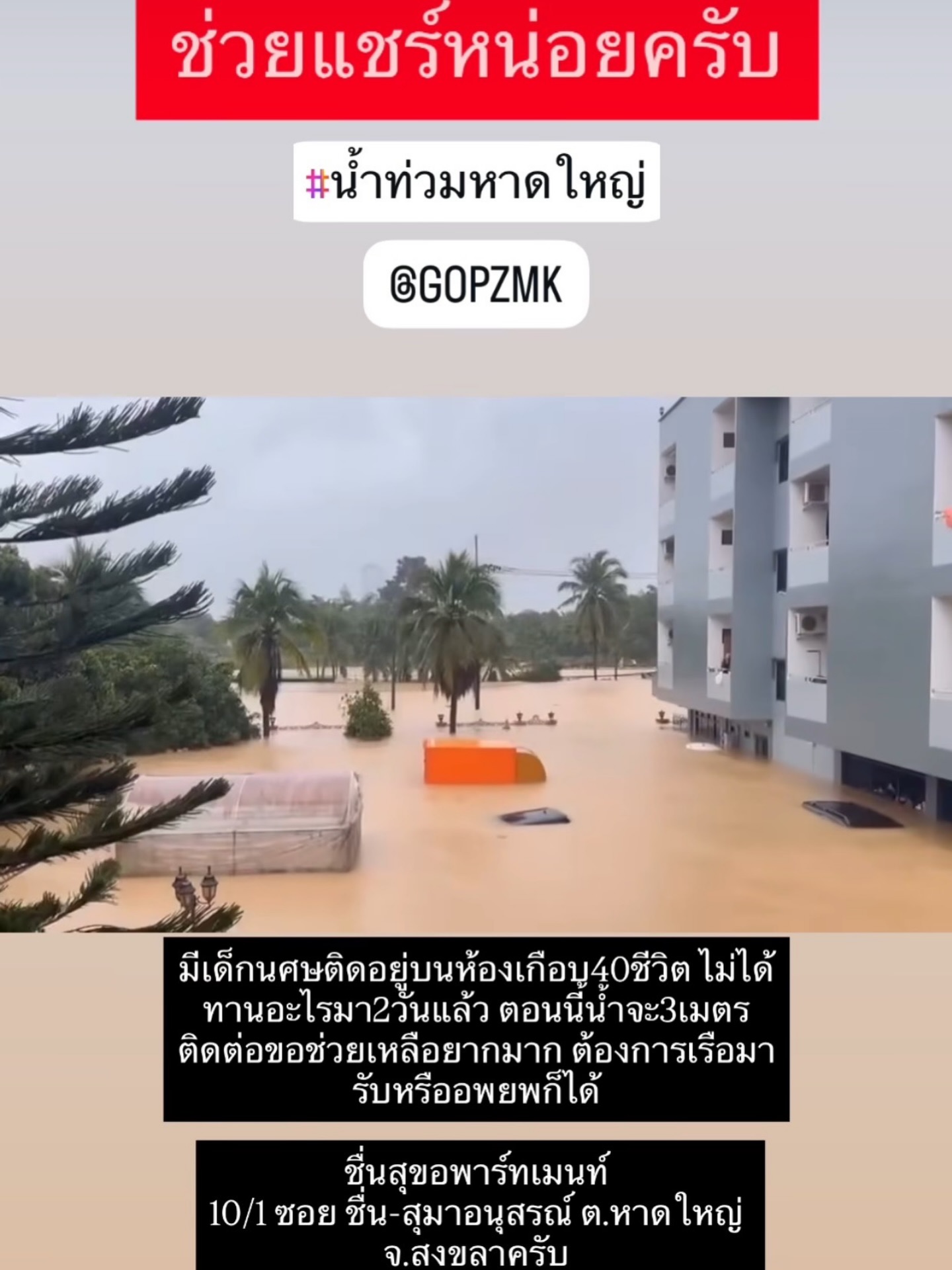 อพาร์ทเมนท์ของน้องที่รู้จัก มีนักศึกษาติดอยู่กว่า 40 ชีวิต ไม่ได้ทานอะไรมา 2 วัน น้ำสูงจะ 3 เมตรแล้วค่ะ ขอความช่วยเหลือค่ะ พิกัด : ชื่นสุขอพาร์ทเมนท์ https://maps.app.goo.gl/VbsZjGcu1oBGicpB7?g_st=ipc #น้ำท่วมหาดใหญ่ #ขอให้ทุกชีวิตปลอดภัยค่ะ🥹