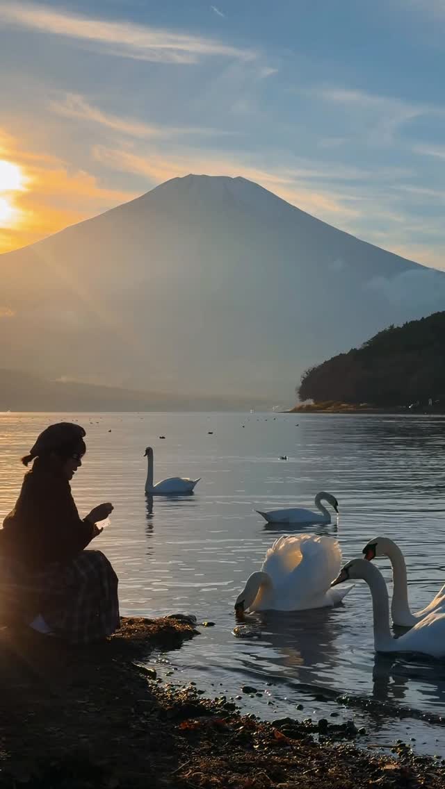 ฟูจิจากยามานะกะโกะคือสวยมากค่ะ มีหงส์ลอยผ่านพอดี ๆ ทำให้ภาพดูละมุนขึ้นเยอะเลย 🩵
