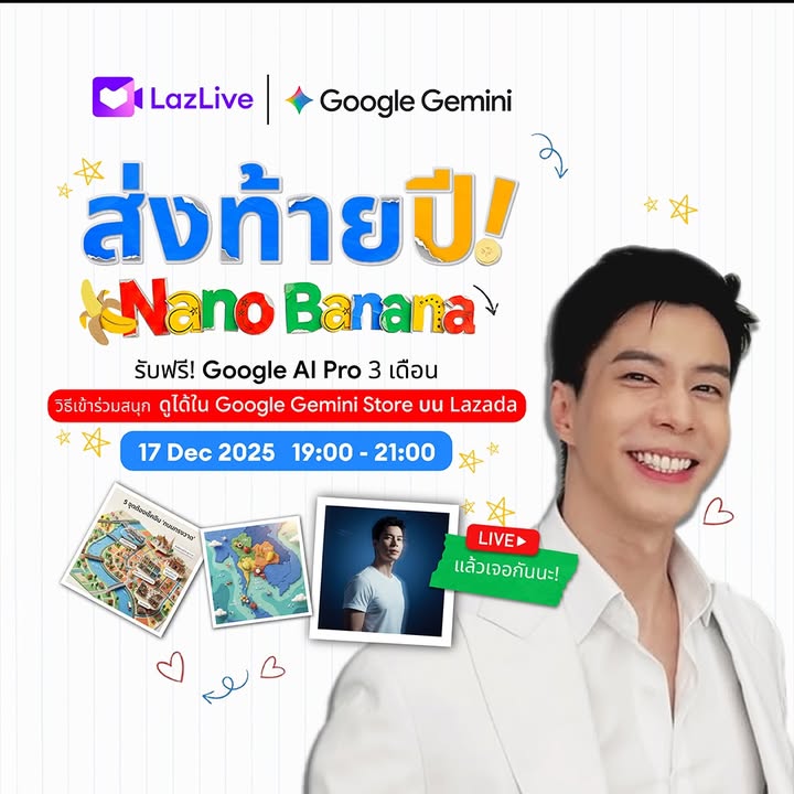 เราจะพาไปรู้จักกันว่า AI Nano Banana สามารถทำอะไรเจ๋งๆได้บ้าง พร้อมแขกรับเชิญสาย Gadget 2 คน ได้แก่ คุณเฟรช จาก Channel FreshZ และ คุณแฟ้มส์ จาก Channel ZZT Zixzester ที่จะมาแชร์ประสบการณ์เจ๋งๆในการใช้ AI กัน แถมในไลฟ์ยังมีแจก Google AI Pro ฟรี 3 เดือนอีกด้วย! ห้ามพลาดเลยน้า เจอกันวันนี้ใน LazLive เวลา 19:00 - 21:00 ที่ Google Gemini Store กดที่ลิ้งนี้ได้เลย https://bit.ly/GeminiXLazadastore และอีกช่องทางสามารถรับชมผ่าน IG live ของเเบม @bam_pitipatt ได้เลยครับ!!