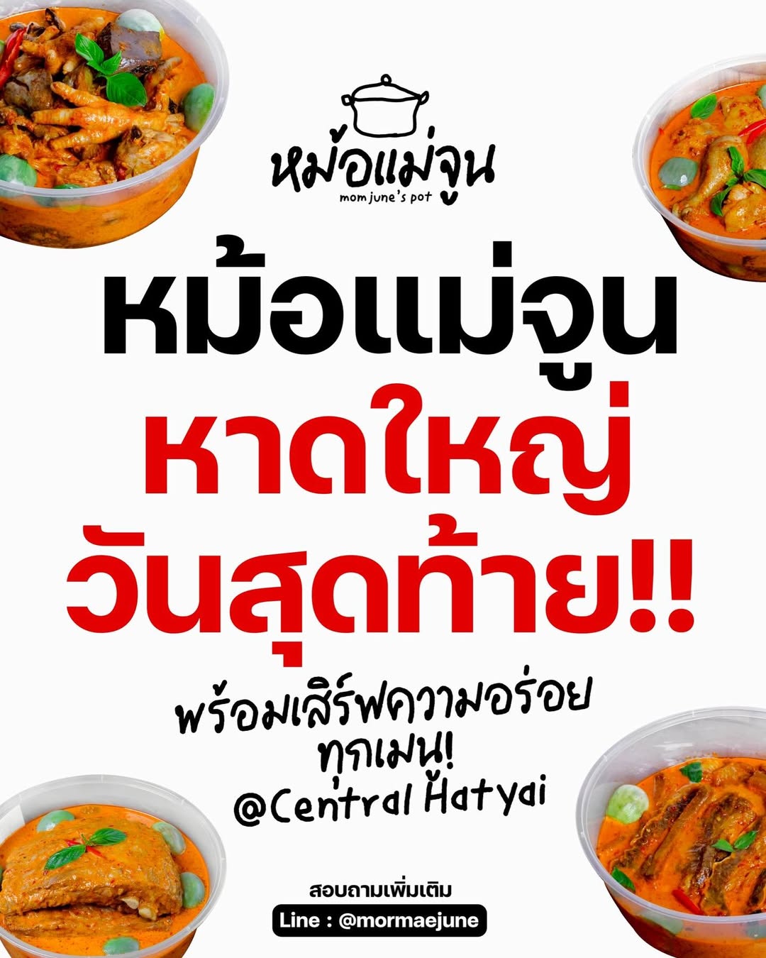 กราบขอบคุณจากหัวใจ…..วันนี้วันสุดท้ายแล้วที่เราจะได้ดูแลกันในเรื่องของอาหารกับหม้อแม่จูนที่ Central หาดใหญ่…ขอบคุณสำหรับการตอบแทนด้วยน้ำใจที่อบอุ่นมากๆๆๆๆ…ตลอด13วันที่นี่….ดีใจที่ทุกคนมอบความรักเป็นการตอบแทนมากับหม้อแม่จูน…น้ำตาจะไหล….แล้วเราจะกลับมาพบกันใหม่กับวันดีๆแบบนี้นะคับทุกคน….ขอกราบขอบพระคุณจากหัวใจอีกครั้ง…เปิ้ลนาครและแม่จูน….. #หม้อแม่จูน #CentralHatyai #สงขลาหาดใหญ่ @mor.maejune