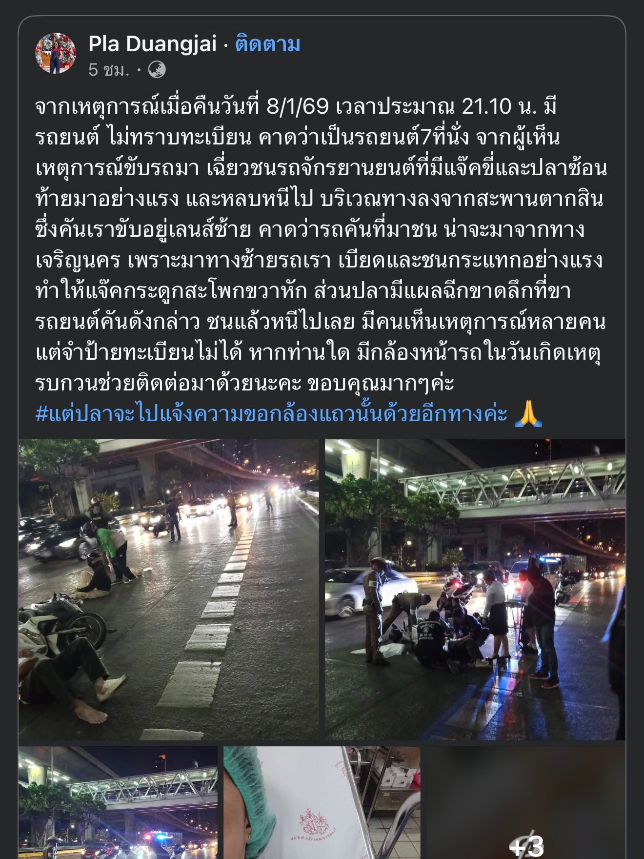 จากเหตุการณ์เมื่อคืนวันที่่ 8/1/69 เวลาประมาณ 21.10 น. มีรถยนต์ ไม่ทราบทะเบียน คาดว่าเป็นรถยนต์7ที่นั่ง จากผู้เห็นเหตุการณ์ขับรถมา เฉี่ยวชนรถจักรยานยนต์ที่มีแจ๊คขี่และปลาซ้อนท้ายมาอย่างแรง และหลบหนีไป บริเวณทางลงจากสะพานตากสิน ซึ่งคันเราขับอยู่เลนส์ซ้าย คาดว่ารถคันที่มาชน น่าจะมาจากทางเจริญนคร เพราะมาทางซ้ายรถเรา เบียดและชนกระแทกอย่างแรง ทำให้แจ๊คกระดูกสะโพกขวาหัก ส่วนปลามีแผลฉีกขาดลึกที่ขา รถยนต์คันดังกล่าว ชนแล้วหนีไปเลย มีคนเห็นเหตุการณ์หลายคนแต่จำป้ายทะเบียนไม่ได้ หากท่านใด มีกล้องหน้ารถในวันเกิดเหตุรบกวนช่วยติดต่อมาด้วยนะคะ ขอบคุณมากๆค่ะ