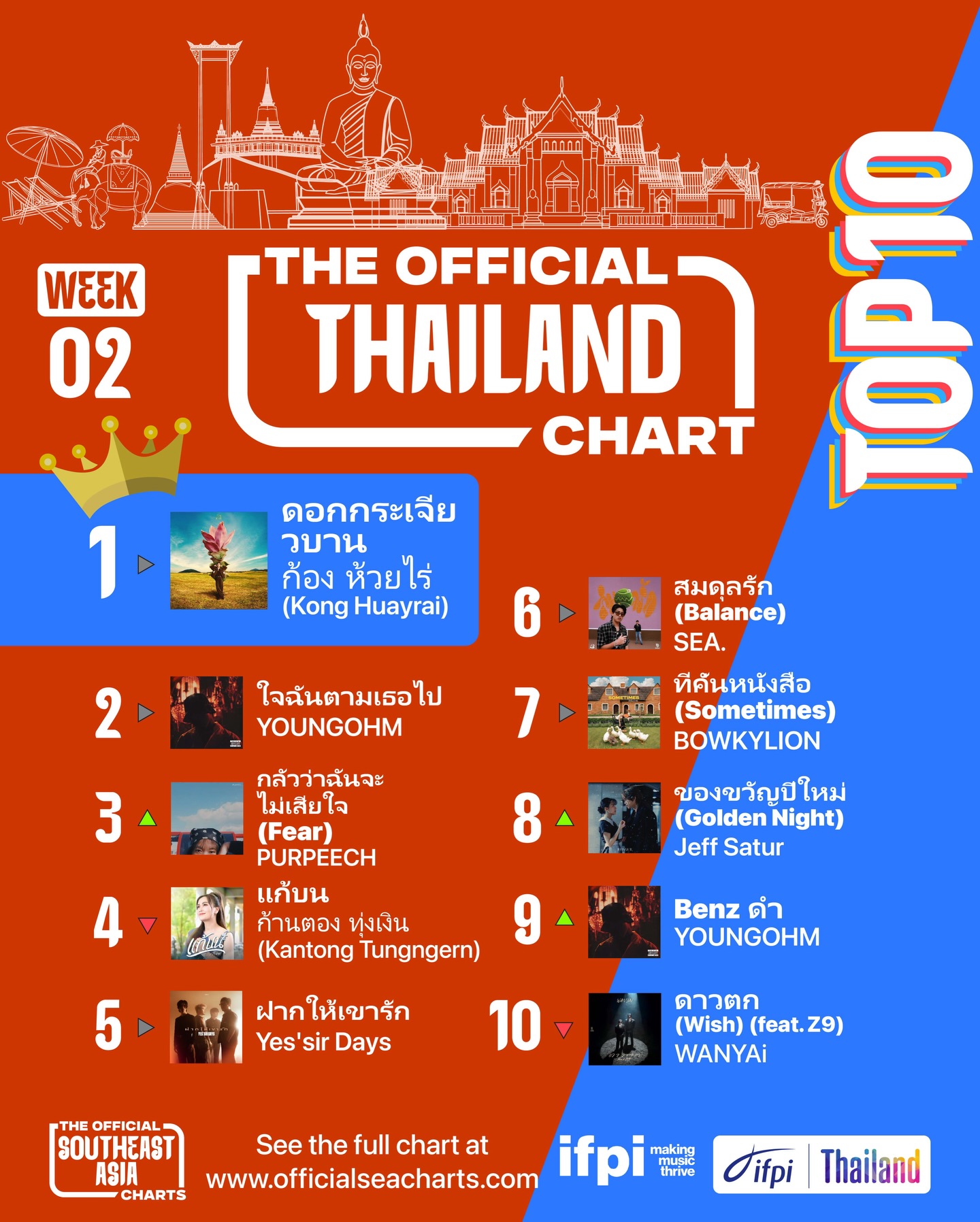 Keeping strong! 🇹🇭💪🏻 Kong Huayrai’s @konglha_30 “ดอกกระเจียวบาน” maintains the top spot on The Official Thailand Chart for a second straight week!