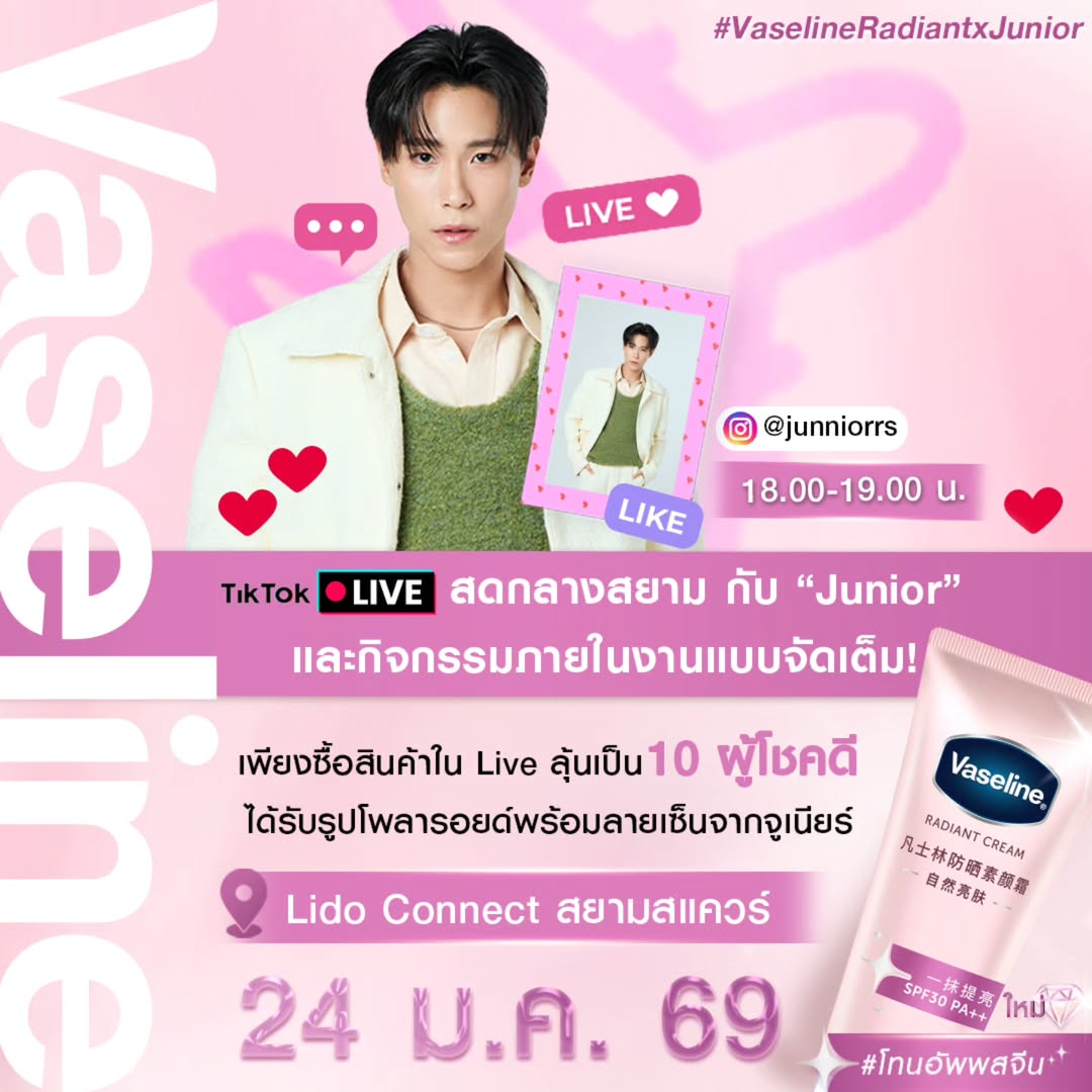 ใครยังไม่มีนัดวันเสาร์ที่ 24 มกราคม 2569 นี้ มาให้กำลังใจกันที่งาน Vaseline Radiant Pop-Up Live Event ได้นะครับ