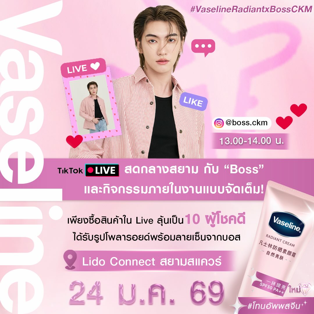 ทุกคนครับ เสาร์ที่ 24 มกราคม 2569 นี้ อย่าลืมมาเจอกันที่ Vaseline Radiant Pop-Up Live Event ที่ Lido Connect ลานด้านหน้ากันนะครับ!