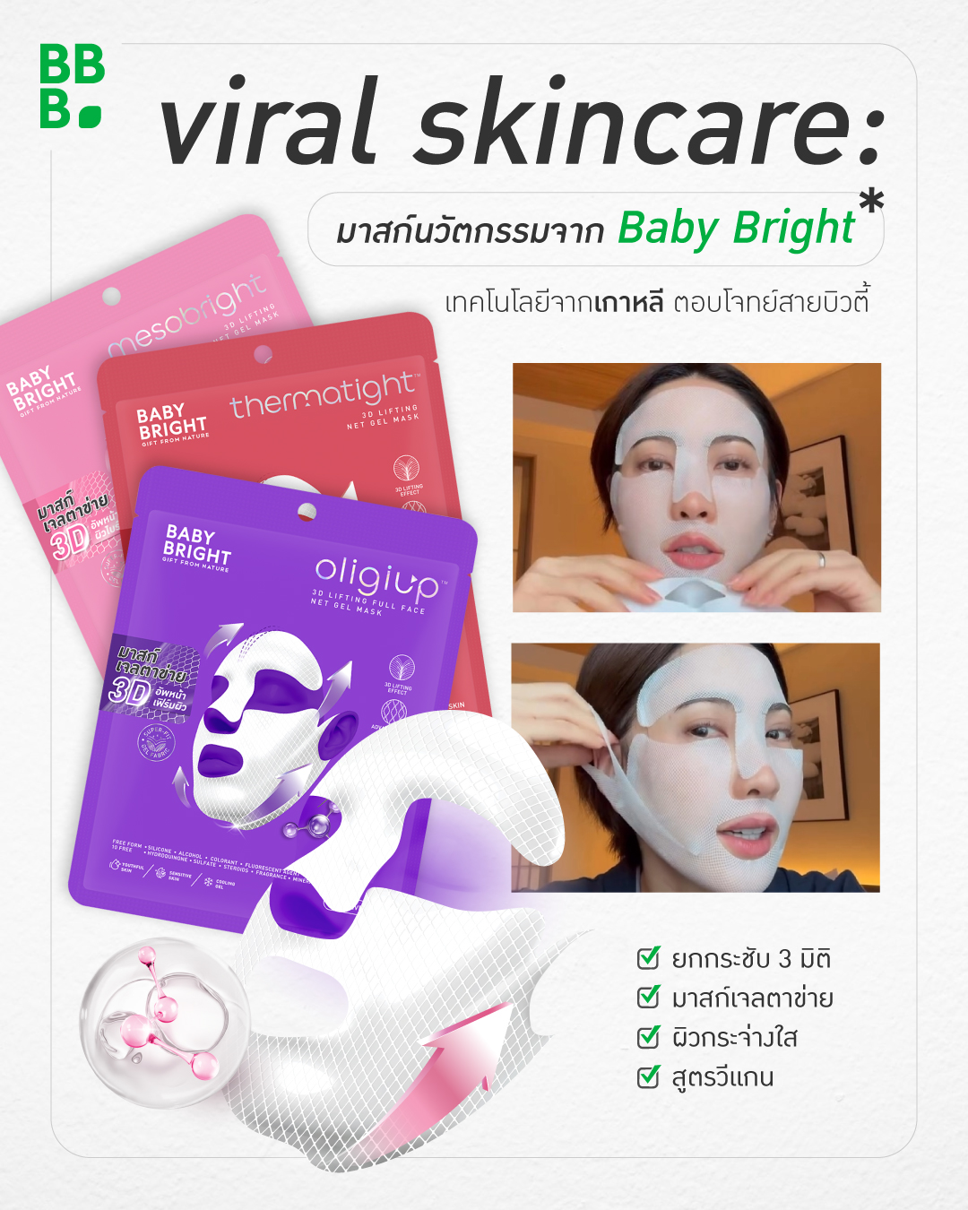 𝐕𝐢𝐫𝐚𝐥 𝐬𝐤𝐢𝐧𝐜𝐚𝐫𝐞 มาสก์นวัตกรรม 𝟑𝐃 𝐋𝐢𝐟𝐭𝐢𝐧𝐠 𝐍𝐞𝐭 𝐆𝐞𝐥 𝐌𝐚𝐬𝐤 จาก Baby Bright เทคโนโลยีจากเกาหลี ตอบโจทย์สายบิวตี้ แผ่นมาสก์ยกกระชับผิวหน้าและกรอบหน้า ด้วยนวัตกรรม 3D Lifting Super-Fit Net Gel Fabric อัปเกรดมีหูเกี่ยวแล้ว!!
