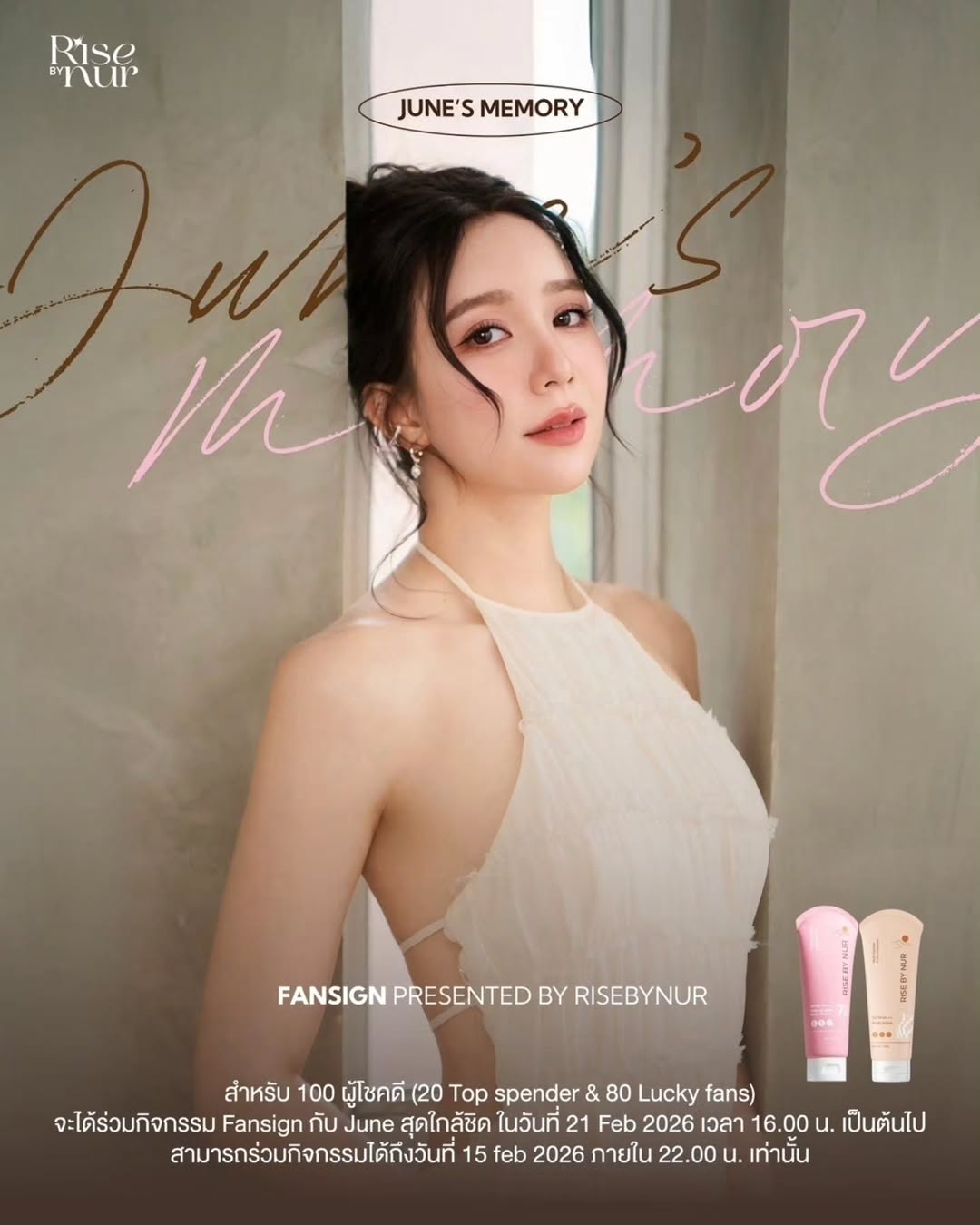 June’s memory fansign✨💕 สำหรับผู้โชคดี 100 ท่าน (20 Top spender & 80 Lucky fans) ที่จะได้ร่วมกิจกรรม fansign อย่างใกล้ชิด ในวันอาทิตย์ที่ 21 Feb 2026 วลา 16.00 น. สามารถร่วมกิจกรรมได้ถึงวันที่ 15 feb 2026 ภายใน 22.00 น. เท่านั้น