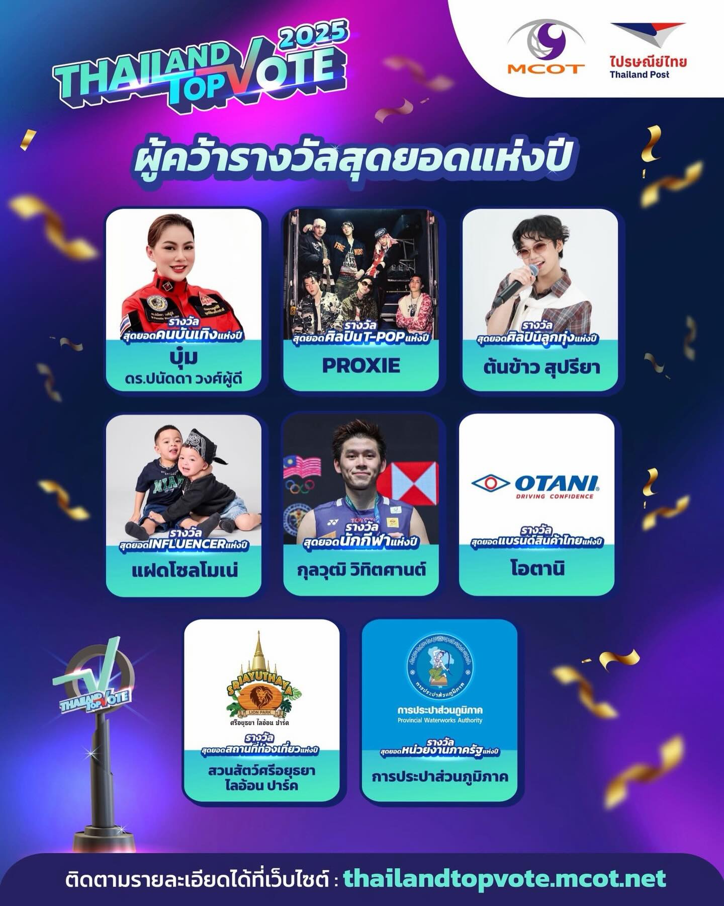 เผยผลโหวตอย่างเป็นทางการแล้ว สำหรับรางวัล “Thailand Top Vote 2025” VOICES OF WORTH เสียงแห่งคุณค่า รางวัลที่สร้างความภาคภูมิใจ สร้างแรงบันดาลใจ พร้อมกำลังใจให้กับบุคคลและองค์กรในหลากหลายวงการ จากการร่วมมือระหว่าง บริษัท อสมท จำกัด (มหาชน) และ บริษัท ไปรษณีย์ไทย จำกัด กับ 8 รางวัลที่มาจากการโหวตของคนทั้งประเทศผ่านทางแอปพลิเคชัน Prompt Post และผู้ที่เป็นนัมเบอร์วันในแต่ละสาขา