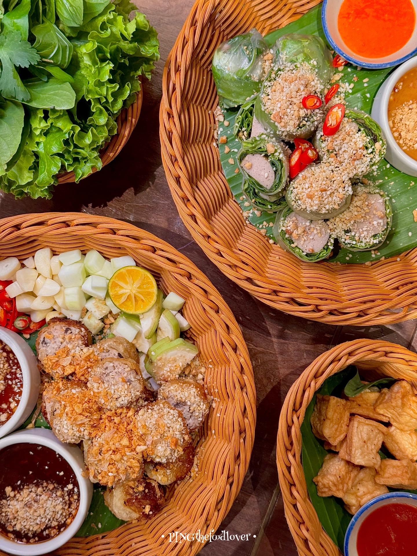 มาถึงร้าน KAO PIAK SEN ทั้งที ก็ไม่พลาดที่จะจัด 🍢“แหนมเนือง”(THB359) มาด้วย เสิร์ฟแผ่นแป้งแหนมเนืองแบบแห้ง มาให้ห่อหมูแหนมเนือง ขนมจีน กล้วยดิบ มะม่วง กระเทียมและพริก เสริมรสเปรี้ยวด้วยส้มมะปี๊ดและรสหวานด้วยน้ำจิ้ม