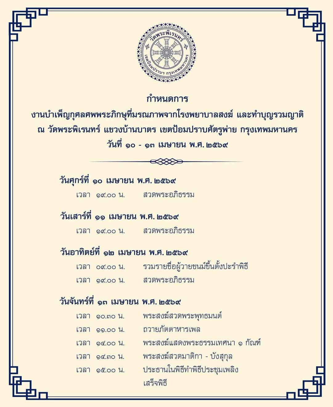 เวลาสงกรานต์ ทุกปี เวลาทำบุญ มดดำ เลือกถึง เผาศพ พระที่มรณภาพจากโรงพยาบาลสงฆ์ แล้วครอบครัวไม่สะดวก จัดงานศพ จะตั้งอยู่ที่วัดพระพิเรนทร์ อยากเชิญชวน ท่านที่อยู่กรุงเทพ มีโอกาสลองไปนะ แต่นี้คือวิธีที่ตัวเองมูมาเกิน15ปี รู้สึกดี รู้สึกดีมากๆๆๆ มันรู้สึกมีพลังในถาวะยุคนี้ ใครมีโอกาสเชิญนะ ใครที่อึดอัดอยู่ คนที่ไม่สบายใจ ทำอะไรแล้วรู้สึกอยู่ที่เดิม เจอปัญหาเยอะๆๆ ลองไปทำบุญ ที่นี้ และสะเดาะเคราะห์ บังสกุลดูนะ อย่างน้อยก็เป็นกำลังใจให้ตัวเอง 022214050 เบอร์ติดต่อสำนักงานวัดครับ