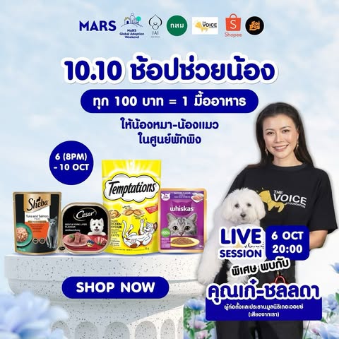 ในแคมเปญ 10.10 ตั้งแต่วันที่ 6-10 ตุลาคมนี้ ทุกการซื้อผลิตภัณฑ์มูลค่า 100 บาท = มาร์ส เพ็ทแคร์ มอบอาหาร 1 มื้อให้กับน้องๆ ในมูลนิธิเดอะวอยซ์และศูนย์พักพิงพันธมิตร