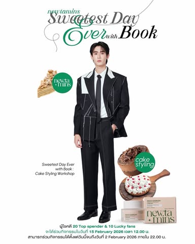 🧁🍰Sweet day ever with Book🥰💕 สำหรับผู้โชคดี 30 ท่าน (20 Top spenders & 10 Lucky fans) จะได้มาร่วมกิจกรรมสุดพิเศษ กับ Book ในวันที่ 15 Feb 2026 เวลา 12.00น. เป็นต้นไปค้าบบบ