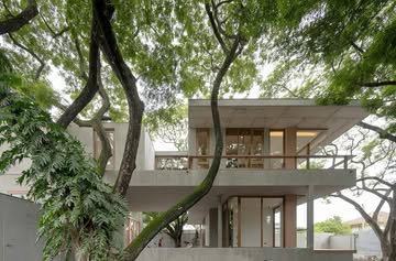 ปกติแล้วต้นไม้มักเป็นส่วนประกอบหนึ่งของบ้าน แต่บ้านหลังนี้แตกต่างออกไป เพราะมีต้นไม้ใหญ่สองต้นที่อยู่บนที่ดินของครอบครัวมานานกว่า 50 ปี เป็นพระเอกของเรื่อง สถาปนิกจึงออกแบบบ้านทั้งหลังให้โอบล้อมต้นไม้ และให้ความสำคัญกับธรรมชาติมากที่สุด แนวคิดนี้ตรงกับความต้องการของเจ้าของบ้านที่อยากย้ายออกจากเมือง มาสร้างบ้านสำหรับครอบครัวใหญ่ 3 รุ่น ที่ลูกๆ จะได้เติบโตใกล้ชิดธรรมชาติ และยังได้ดูแลคุณพ่อคุณแม่ไปพร้อมกัน