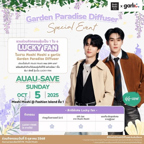 วันที่ 5 ตุลาคมนี้ เวลา 11.30 น. อย่าลืมมาเจอพวกเราในงาน Moshi Moshi x Garlic Garden Paradise Diffuser ที่ Fashion Island ชั้น 1 อู่อู๋และเซฟอยากชวนทุกคนมาร่วมสนุกและลุ้นเป็น 1 ใน 6 Lucky Fan ที่ได้เล่นกิจกรรมและรับของที่ระลึกสุดพิเศษจากพวกเรา มาร่วมกิจกรรมด้วยกันนะครับ
