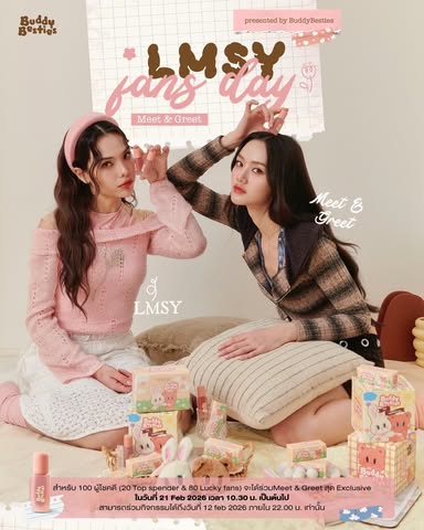 LMSY fans day Meet & Greet💕💖 สำหรับผู้โชคดี 100 ท่าน (20 Top spender & 80 Lucky fans) ที่จะได้ร่วมกิจกรรมสุดexclusive กับ Lookmhee Sonya ในวันอาทิตย์ที่ 21 Feb 2026 วลา 10.30 น. สามารถร่วมกิจกรรมได้ถึงวันที่ 12 Feb 2026 ภายใน 22.00 น. เท่านั้น