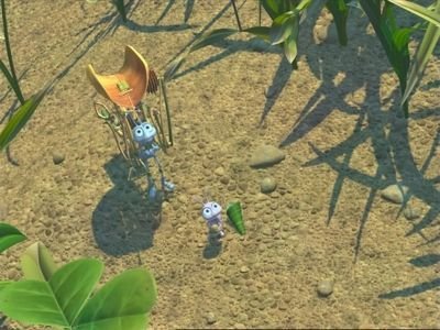Every year, a bunch of grasshoppers come to the anthill and eat what the ants have gathered for them. The "offering", as the ants call the ritual, is a part of their fate. One day in spring, when the offering's preparation has just been finished, Flik (voice: Dave Foley), unliked inventor ant, accidentally drops the whole offered seeds into the river. The grasshoppers come and give the ants a second chance to collect food until fall.