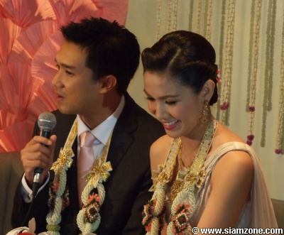 บรู๊ค "ก็บอกว่ารักผม คุณแม่บอกทุกวันอยู่แล้ว แต่วันนี้เป็นวันพิเศษ อย่างที่น้องกบบอกว่ามันเป็นเวลาแห่งความตื้นตัน คุณพ่อก็น้ำตาคลอ ท่านอวยพรให้เราสองคนมีความสุข คุณแม่ด้วย เรียกว่าคุณพ่อคุณแม่ก็พยายามทำเต็มที่ให้งานวันนี้ออกมาได้สมบูรณ์แบบ ถูกต้องตามธรรมเนียมประเพณี มีผู้หลักผู้ใหญ่ มีพี่ๆ สื่อมวลชนมาเป็นพยาน ก็ต้องขอขอบพระคุณทุกท่าน"