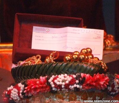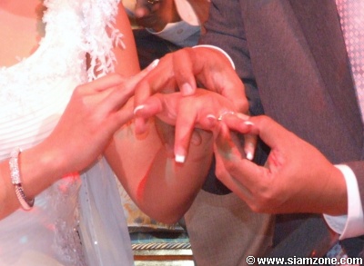 หลังจากพิธีรับสินสอดหมั้น ซึ่งประกอบด้วย แหวนทองคำขาวประดับเพชร เครื่องทอง เงินสดจำนวนหนึ่ง รวมถึงเช็คเงินสดไม่ระบุจำนวนเงิน และทั้งคู่รับคำอวยพรจากผู้ใหญ่ทั้ง 2 ฝ่ายเสร็จสิ้นลง ก็ได้ฤกษ์สวมแหวน เมื่อเวลา 09.09 น. และเมื่อผ่านพิธีอันเป็นมงคลนี้แล้ว ผู้ร่วมงานทุกคนในโรงละครได้ลุกขึ้นยืน ร่วมกันร้องเพลงสรรเสริญพระบารมี และเพลงสดุดีมหาราชา เพื่อร่วมถวายความจงรักภักดีต่อพระบาทสมเด็จพระเจ้าอยู่หัวและพระบรมวงศานุวงศ์