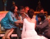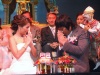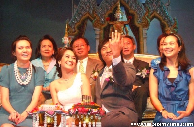 สำหรับบนเวทีพิธีหมั้น ประกอบด้วยเถ้าแก่ฝ่ายชาย "คุณลือรัตน์ โคมสวัสดิชัย" ส่วนเถ้าแก่ฝ่ายหญิง คือ "คุณสมัคร เชาวภานันท์" วุฒิสมาชิก และประธานคณะกรรมาธิการการยุติธรรมและตำรวจ วุฒิสภา รวมทั้งคุณแม่ และญาติๆ ของทั้งสองฝ่าย โดยมี วิลลี่ หอย และ แหม่ม เป็นพิธีกรอยู่บนเวที ทำให้บรรยากาศเต็มไปด้วยความเป็นกันเองและสนุกสนาน โดยเฉพาะ วิลลี่ และ หอย ที่คอยเรียกเสียงฮา ด้วยการแซว เปิ้ล เป็นระยะๆ ระหว่างรอฤกษ์