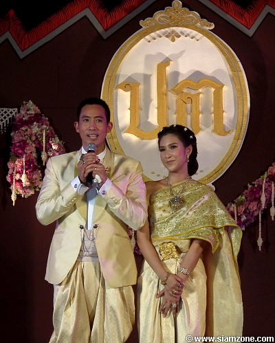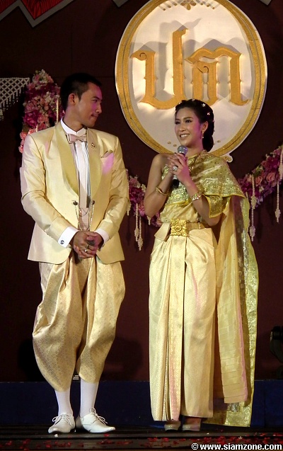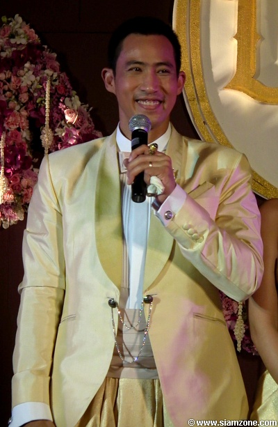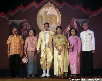 ตั๊ก "เราตั้งธีมไว้ว่าเป็นไทยร่วมสมัย มีหลายท่านที่ได้เห็นการ์ดผมแล้วถามว่าชุดไทยร่วมสมัยเป็นยังไง ก็บอกว่าเดี๋ยวผมค่อยตอบแล้วกันในงาน ยังไม่ตอบเพราะว่าผมจะถามไปเรื่อยๆ ว่าความคิดท่านเป็นยังไง ตั้งแต่แจกการ์ดให้กับผู้ใหญ่อย่างเช่น ผู้ใหญ่ทางฝั่งผมเองก็ถามว่า ตั๊กชุดไทยร่วมสมัยเป็นยังไง ผมบอกว่าไม่ตอบครับแล้วแต่ท่านจะคิด"