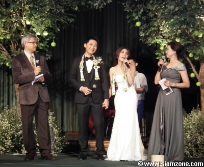 ส่วนช่วงเย็นของวันเดียวกันเป็นงานเลี้ยงฉลอง ณ ห้องแกรนด์บอลรูม โรงแรมแกรนด์ไฮแอท เอราวัณ สนุกสนานตั้งแต่เปิดตัวคู่บ่าวสาว อีกทั้งความน่ารักและความจริงใจที่มีต่อกันของคู่นี้ เป็นที่ประทับใจของแขกที่เข้าร่วมงาน โดยเจ้าบ่าวเผยว่าเป็นคนไปขอให้ แอน ช่วยทำหน้าที่แม่สื่อ "พูดกี่ครั้งก็จะพูดเหมือนเดิมว่าเป็นคนไปขอให้พี่แอน ไปขอนะฮะ ไปขอพี่แอนเองเลยว่าช่วยหาแฟนให้ อยากได้แฟนที่เป็นคริสเตียนด้วยกัน คือผมอยากจะมีคู่ชีวิตที่มีเป้าหมายเดียวกัน วิธีคิดเหมือนกัน เส้นทางเดียวกัน ก็คือการที่เป็นคริสเตียนที่ดีและก็มีพระเจ้าเป็นคนนำทางครับ เพราะฉะนั้นจะเห็นจากในวิดีโอที่นำเสนอเรื่องราวของทั้งคู่ไปเมื่อสักครู่ เราเริ่มกันด้วยเรื่องของความรัก ซึ่งเป็นบทหนึ่งในพระคัมภีร์ครับ"