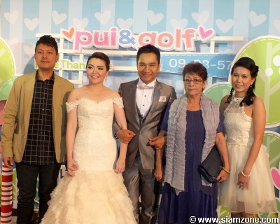 กอล์ฟ "ความรู้สึกวันนี้เหรอ สนุกสนาน (หัวเราะ) ตื่นเต้น ตื่นเต้นหลายอย่างเลย เพราะว่าวันนี้เป็นพิธีจริงแล้วอ่ะครับ ครั้งที่แล้วที่เชิญทุกคนมาวันที่ถ่ายภาพพรีเวดดิงนะครับ แต่ว่าวันนี้ก็เป็นพิธีมงคลสมรสจริงๆ แล้ว ก็ตื่นเต้น ก็อยากให้ออกมาดีที่สุดนะครับ เพราะฉะนั้นก็ขอทุกคนแฮปปี้ละกัน (หัวเราะ) เพราะว่าเวลาเตรียมงานค่อนข้างน้อยนะครับ"