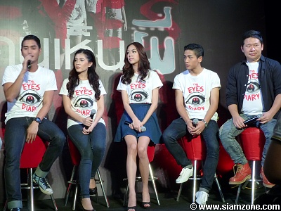 สำหรับบรรยากาศงานแถลงข่าวภาพยนตร์เมื่อวันที่ 1 ตุลาคม 2557 นั้น ทางผู้จัดได้เนรมิตสถานที่ ณ โรงภาพยนตร์ เอส เอฟ เวิลด์ ซีเนม่า ให้มีความหลอนคล้ายบ้านผีสิง และเปิดงานด้วยการแสดงสดจากนักร้องหนุ่ม "ธนพล มหัทธนาดุลย์" หรือ "พละ เดอะวอยซ์" ที่มาในเพลง "คิดถึง" ซึ่งเป็นเพลงหลักที่ใช้ประกอบภาพยนตร์เรื่อง The Eyes Diary อีกด้วย ต่อจากนั้นผู้กำกับ และเหล่านักแสดงทั้งหมดก็ได้มาร่วมพูดคุยกันถึงภาพยนตร์เรื่องนี้